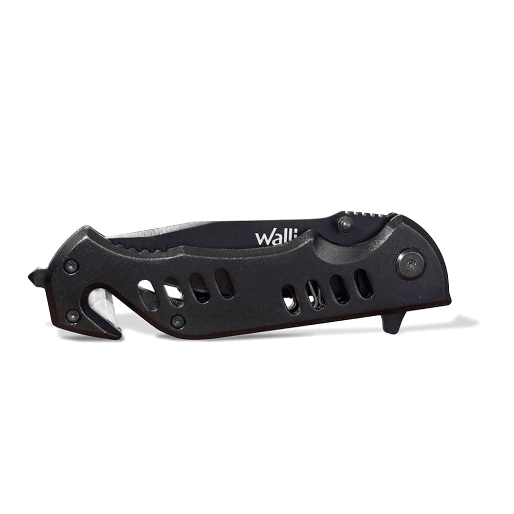 Navaja Wallis de bloqueo con hoja negro mate lisa con sierra. El mango está hecho de metal negro. En el mango tiene un clip para que la lleves cómodamente ya sea en la cintura, en tu vestimenta o en donde la quieras tener a la mano.
